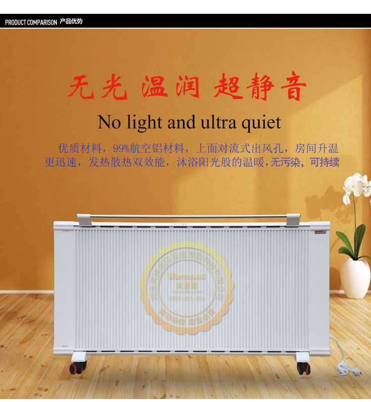 優(yōu)勢二:舒適!碳晶遠紅外電暖器使用中無“小太陽”光照污染問題,無空調(diào)或者熱風(fēng)機噪音、揚塵問題。