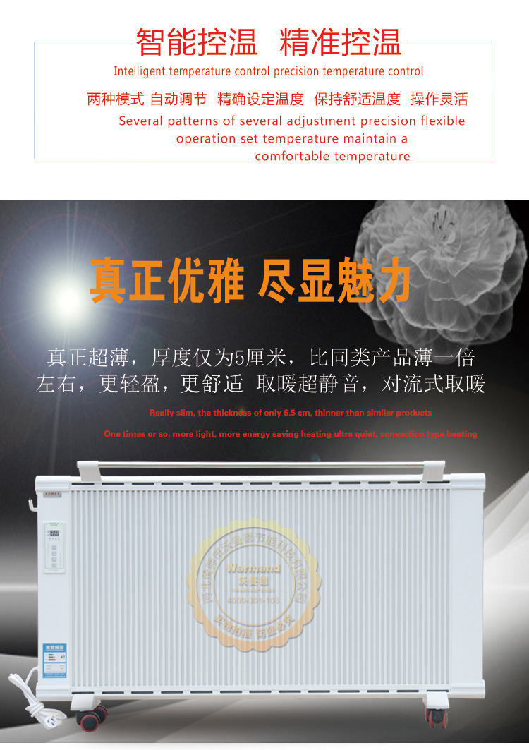 沃曼德碳晶電曖器,分為壁掛式、地暖式,功率從900-1500W,造型美觀大方、結構堅固耐用,