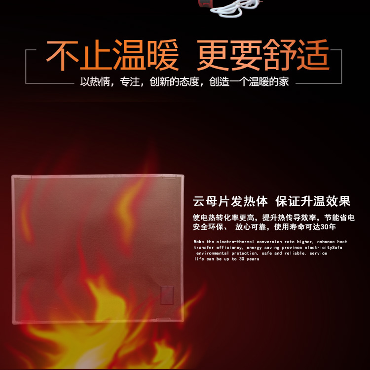 堅固耐用,不易損壞,使用壽命長達20-30年。產(chǎn)品的零部件和整機均經(jīng)嚴格篩選、老化和檢測,導(dǎo)電強度超過國家標準2000V,其碳晶加熱體經(jīng)高壓復(fù)合而成,本產(chǎn)品重量輕、無污染、結(jié)構(gòu)堅固、使用壽命不低于10萬小時。設(shè)有三層溫控 。1發(fā)熱體設(shè)有超溫保護開關(guān)。2溫控器設(shè)有散熱體保護關(guān)3室溫調(diào)節(jié)開關(guān)可設(shè)定取暖溫度的恒溫狀態(tài)。耐電擊強度3000伏以上。絕無磁波輻射。